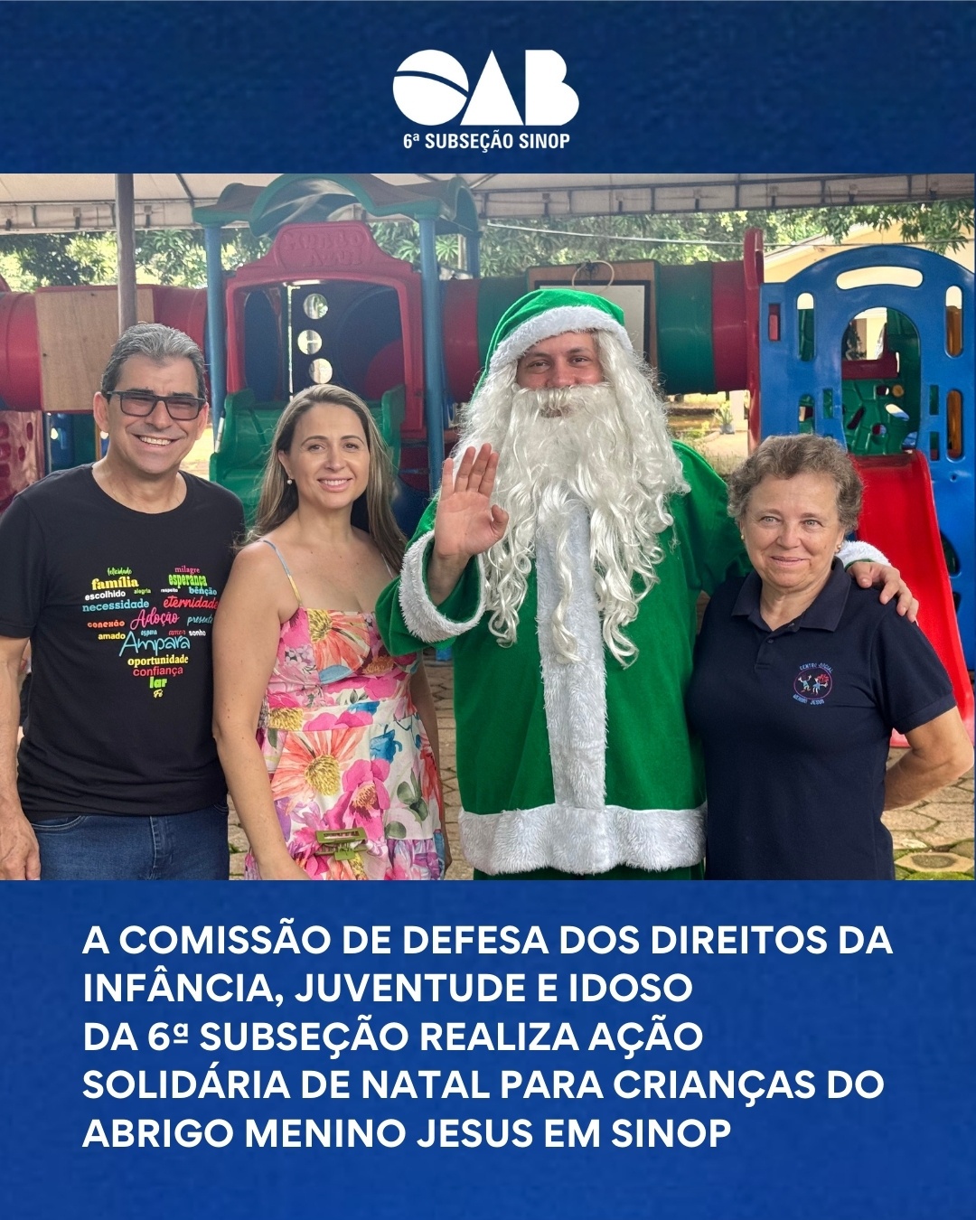 A OAB/Sinop foi representada pela Dra. Manoela Conter de São José, presidente da Comissão de Defesa dos Direitos da Infância, Juventude e do Idoso, que agradeceu a todos os envolvidos e contribuintes, destacando a importância da união de esforços para tornar o Natal dessas crianças mais feliz e significativo.