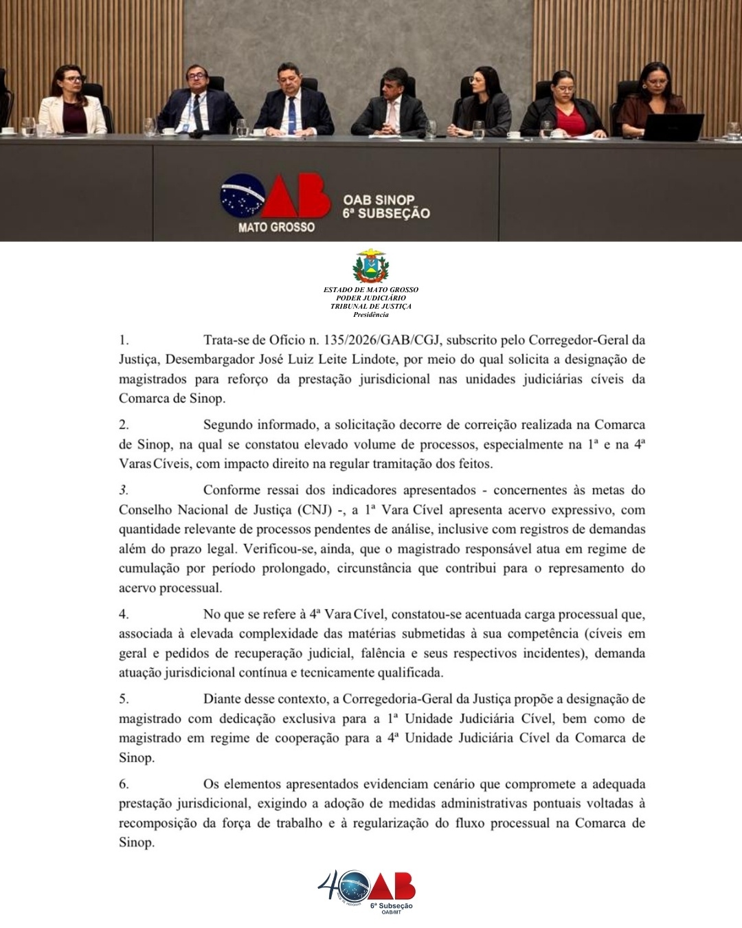 Dentre os resultados concretos, destaca-se a designação de magistrados para atuação nas unidades judiciais da Comarca de Sinop, medida que visa conferir maior celeridade e eficiência à prestação jurisdicional, especialmente na área cível.