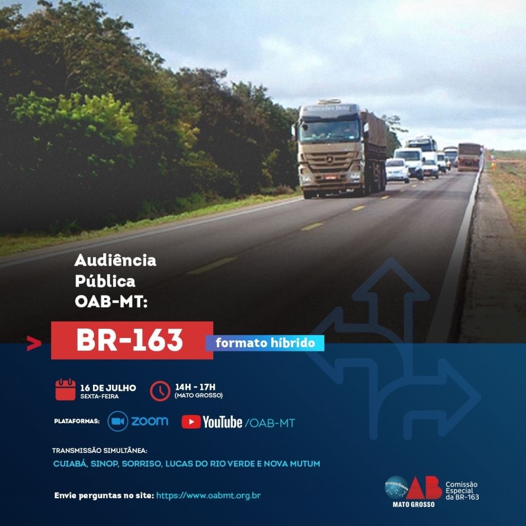 Na próxima sexta-feira, 16 de julho, a Ordem dos Advogados do Brasil – Seccional Mato Grosso (OAB-MT) realizará audiência pública acerca da BR-163 com participação confirmada do Ministro da Infraestrutura, Tarcísio Gomes, e do advogado-geral da União, André Mendonça. O evento terá início às 14h, com realização simultânea na sede da Seccional, na Capital, e nas Subseções de Sinop, Sorriso, Lucas do Rio Verde e Nova Mutum. A audiência será transmitida ao vivo pela página do YouTube da OAB-MT.