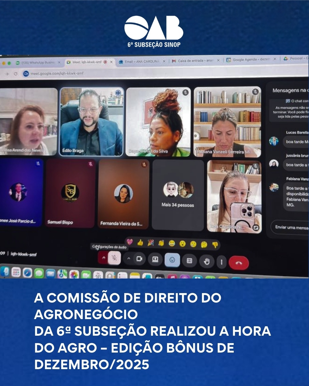 Na última terça-feira (15/12/2025), realizamos com sucesso a edição bônus da Hora do Agro, promovida pela Comissão de Direito do Agronegócio da OAB Sinop, com o tema central “Recuperação Judicial e Alongamento/Prorrogação de Dívidas de Produtores Rurais”. O evento reforçou o compromisso da OAB em fomentar debates jurídicos atuais e relevantes para o fortalecimento do agronegócio regional.